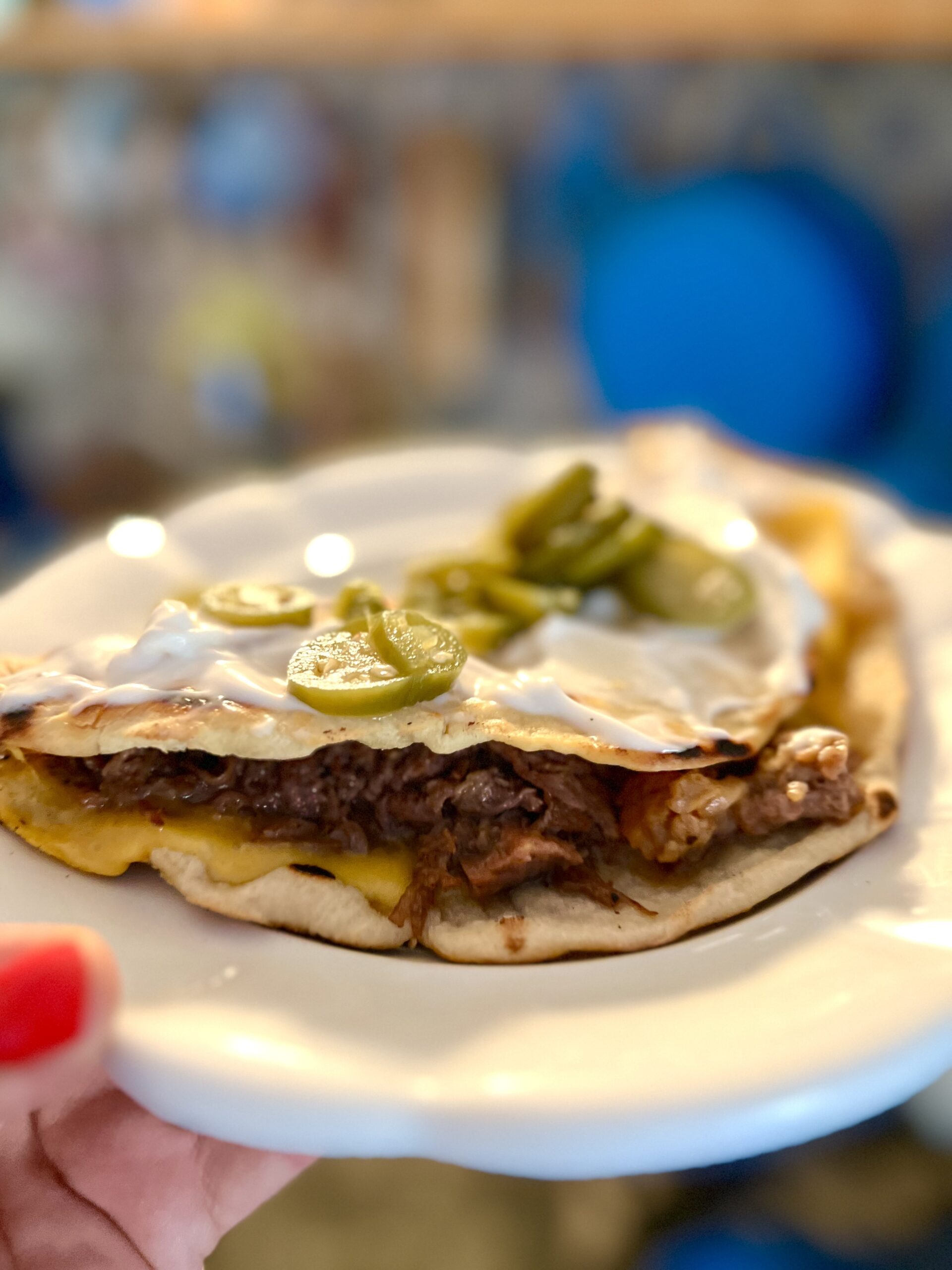 Tortillu kopněte do pánve, na polovinu položte 2 plátky sýra, přidejte vrstvu masa, překlopte na půl a zapečte. Přendejte na talíř, potřete zakyskou a přikryjte jalapeňos viz. video.